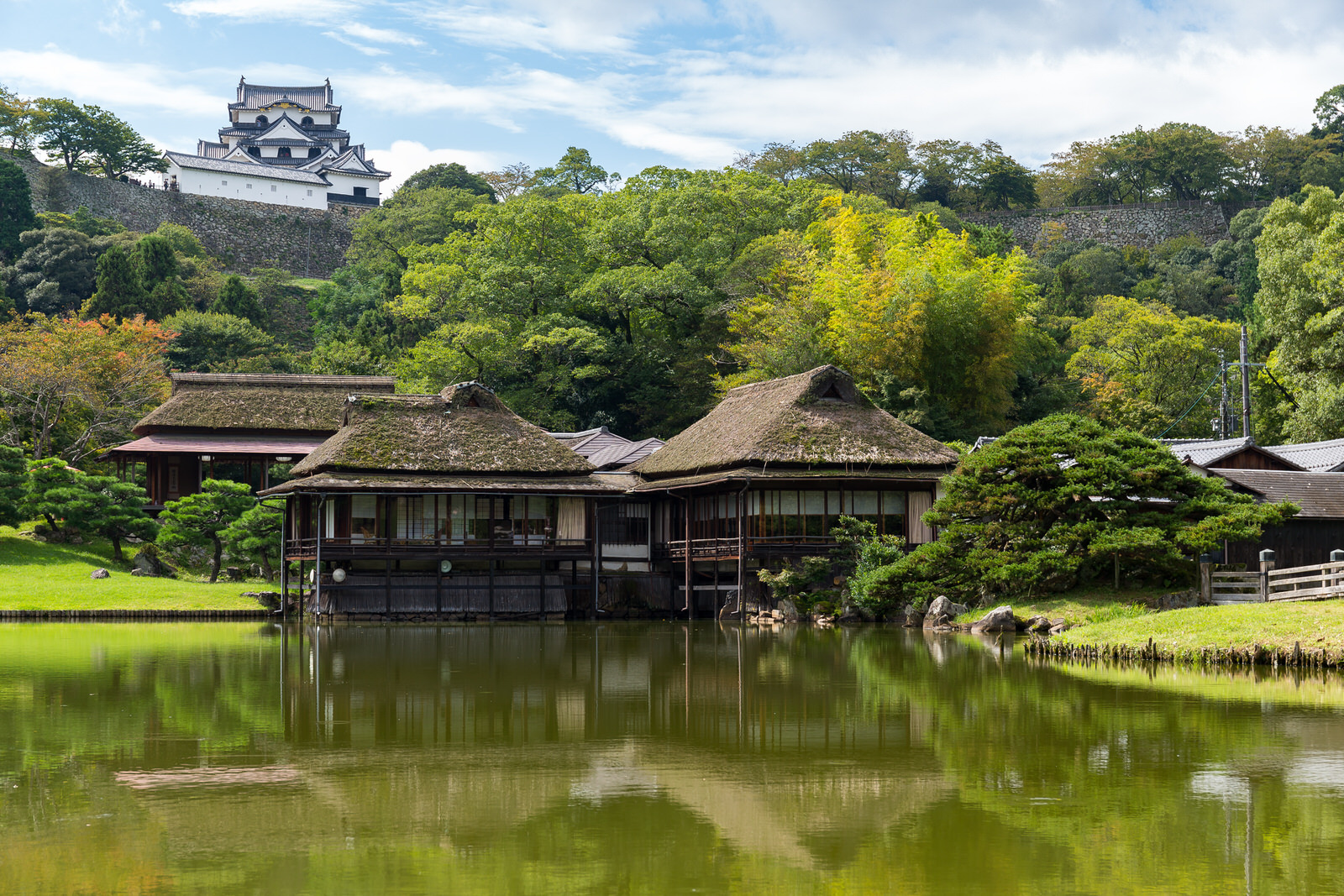 По соседству с замком расположен сад Гэнкюэн — созданный как прогулочный сад для даймё. Природный пейзаж здесь тщательно продуман: пруды с островками, изящные чайные домики и мостики отражают идеал японской гармонии.